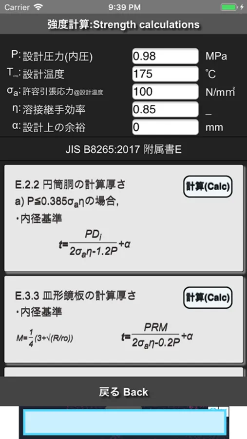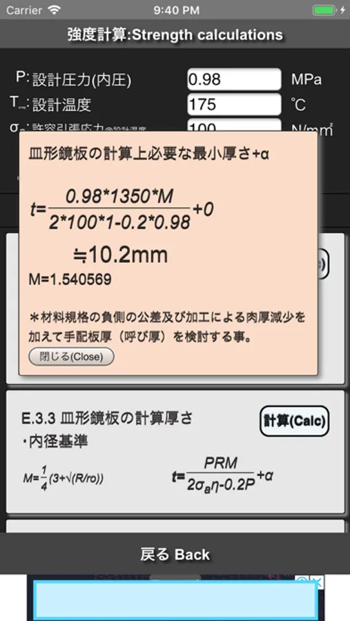さらに、簡易強度計算機能もあり、設計圧力(内圧のみ)と使用材料の許容引張応力(設計温度による)から計算板厚を求めることもできます。