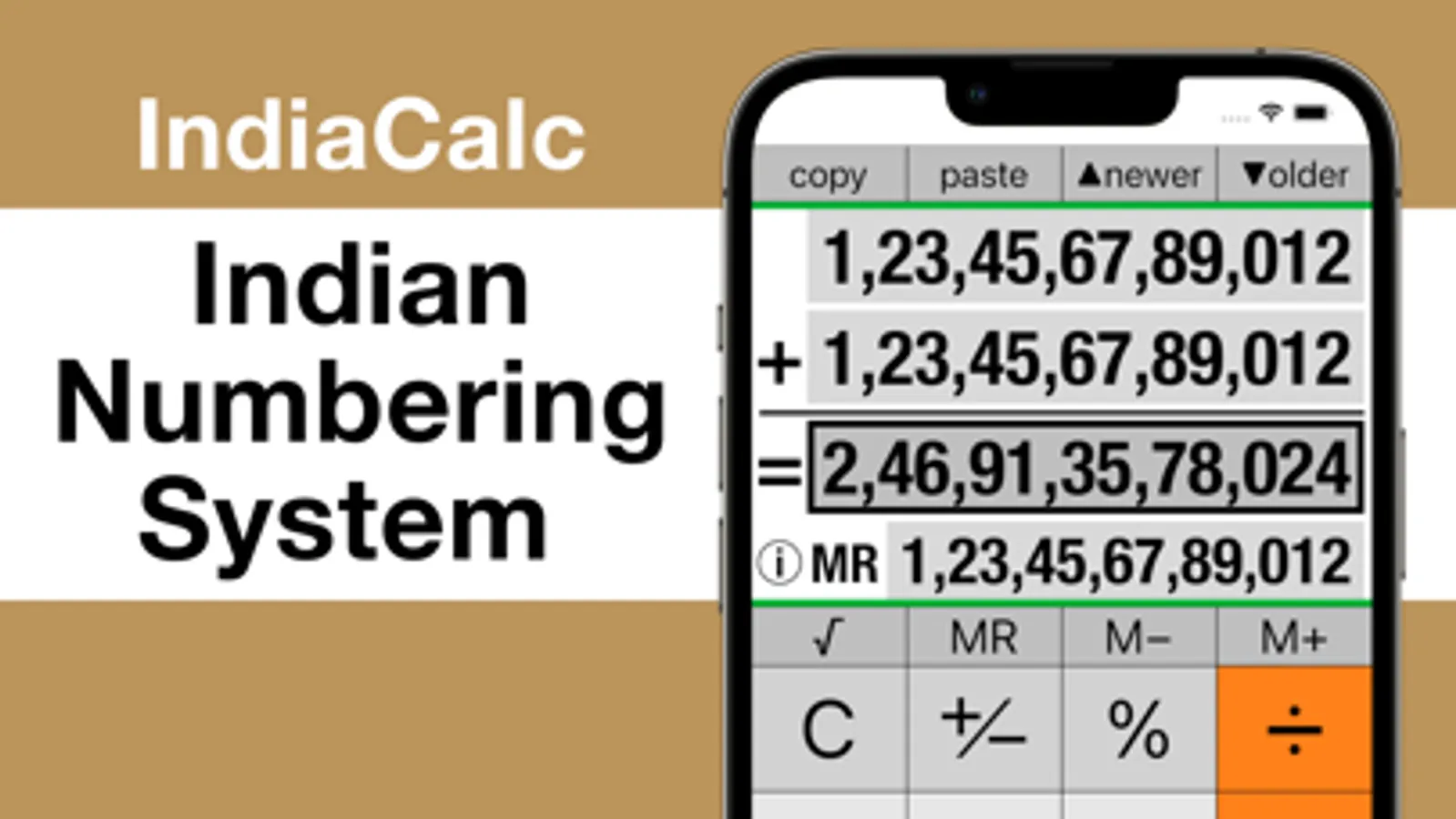 IndiaCalc is a calculator that adapts Indian numbering system, which groups by sets of two digits except the rightmost three digits.