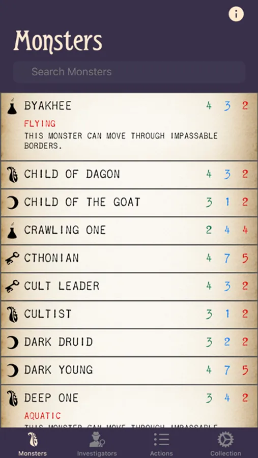 - Full list of monsters from the game with their individual Awareness, Horror and Brawn stats readily available for easy reference. A small info button also highlights what each of the numbers stands for if you need a reminder at any time.