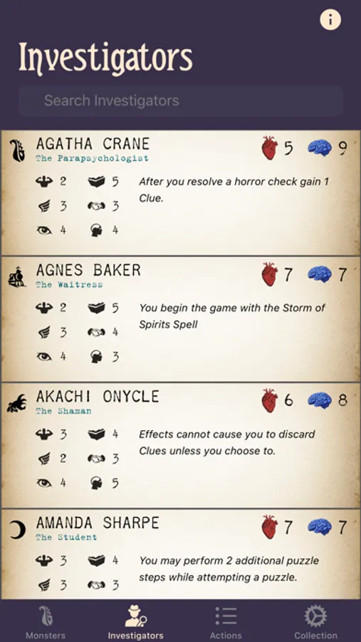 - Full list of investigators from the game with all stats listed for easy reference. You have the ability to select an investigator that will update the Actions tab to show any additional special actions that investigator may give you.