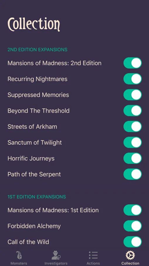 - A full collection manager which gives you the ability to select which expansions are in your collection and the rest of the app features will auto adjust to only show you things that apply to your current collection. This includes all expansions from Mansions of Madness 2nd Edition as well as the core game and expansions from the 1st edition of the game. There are also options to select which of the DLC scenarios you have at your disposal if you would like to track those as well.