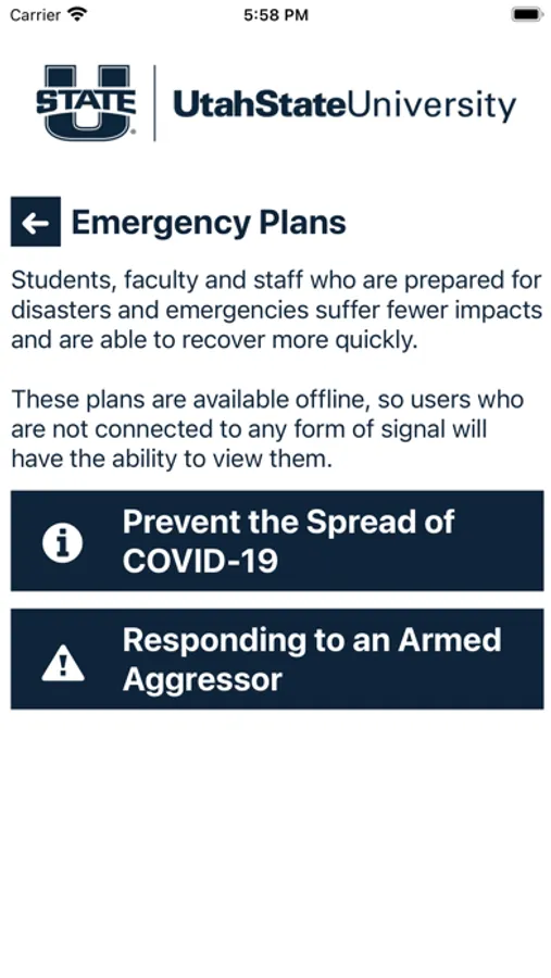 - Emergency Plans: Campus emergency documentation that can prepare you for disasters or emergencies. This can be accessed even when users aren’t connected to Wi-Fi or cellular data.
