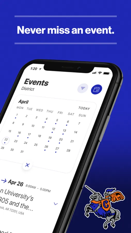 The event section shows a list of events throughout the district. Users can add an event to your calendar to share the event with friends and family with one tap.