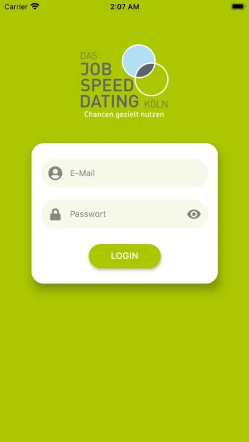 Achtung: Die Nutzung der App ist nur mit einem Job Speed Dating Köln Account möglich. Zugangsdaten erhalten alle angemeldeten Teilnehmer*innen und Arbeitgeber. Bitte sprechen Sie mit Ihrer Integrationsfachkraft im Jobcenter Köln über eine Teilnahme am JobSpeedDating 2022 oder besuchen Sie unsere Website (www.das-jobspeeddating.koeln).
