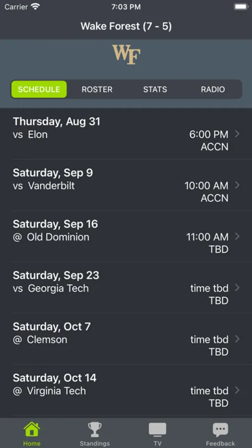 Wake Forest Football provides scores, links to live radio, schedules, tv channels, player profiles, and game matchups in one location.