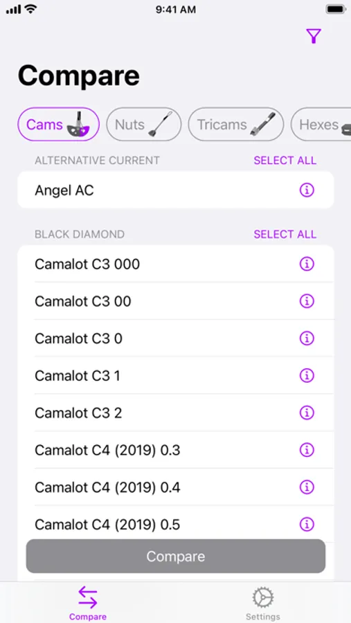 Easily compare different types of climbing gear! Including cams, nuts, hexes, and more!