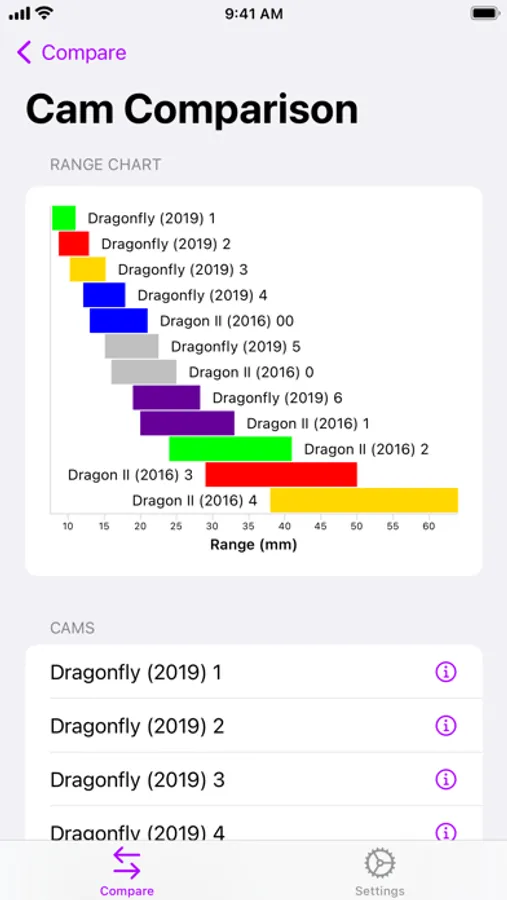 Each item can be easily compared on a chart to visualise its size compared to the other items. This is especially useful for comparing gear models from different manufacturers or evaluating any holes in a mismatched rack.