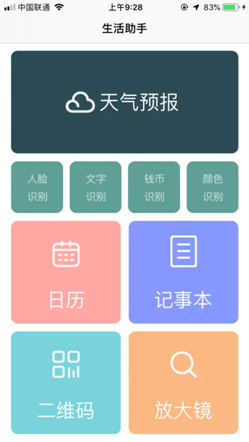 本软件支持全程语音导航与专用手势操作,支持人脸识别、文字识别、日历、记事本、天气预报、颜色识别、钱币识别、二维码识别、放大镜。