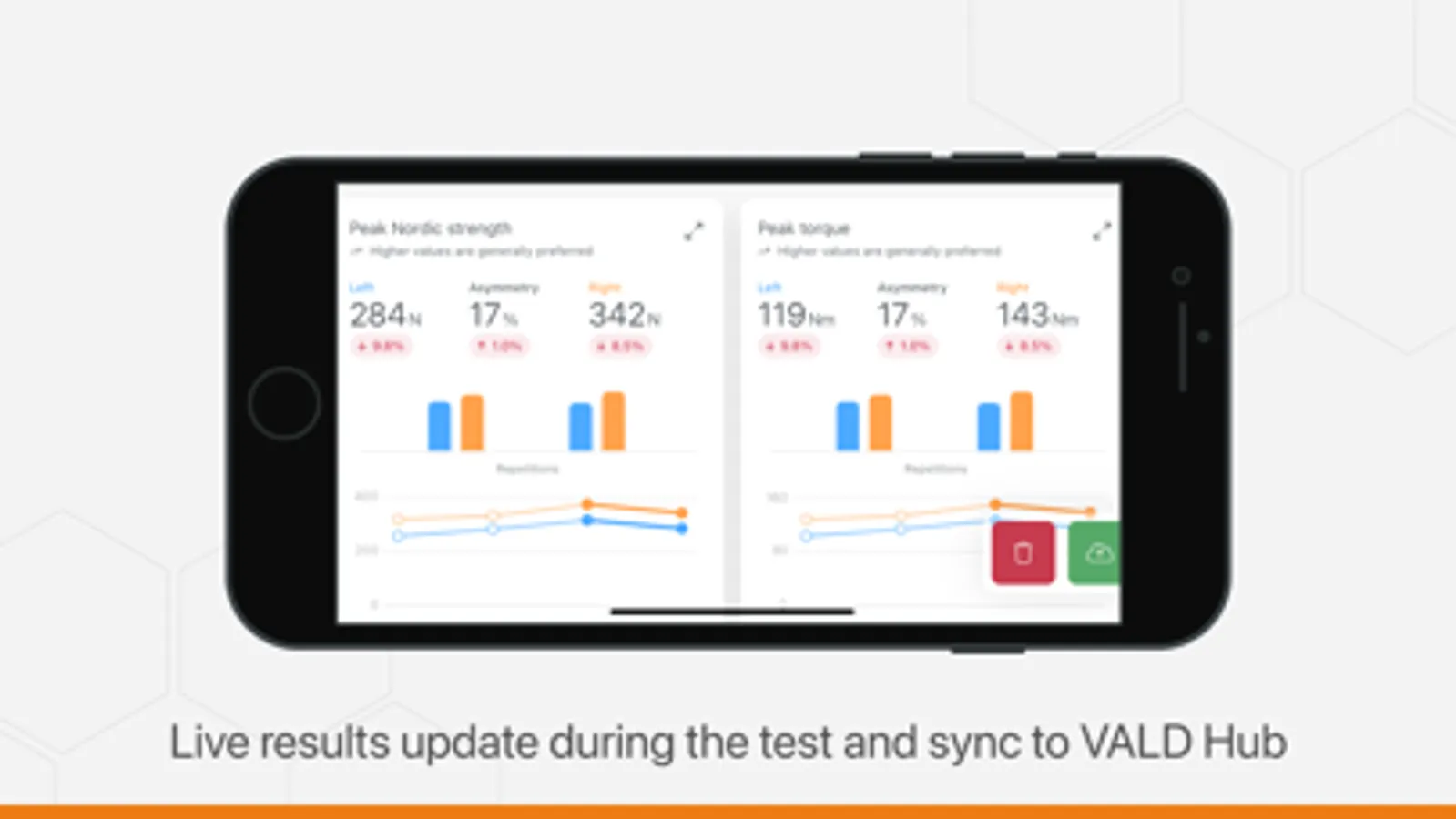 Connect to The NordBord via Bluetooth for rapid testing of isometric and eccentric hamstring strength. The live force graph provides visual bio-feedback in real-time and highlights max hamstring strength and left / right imbalance to facilitate rapid decision making.