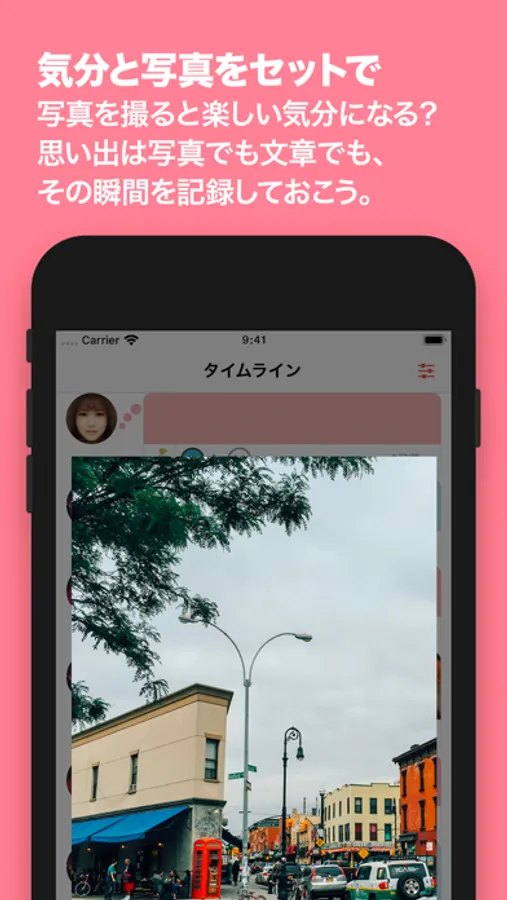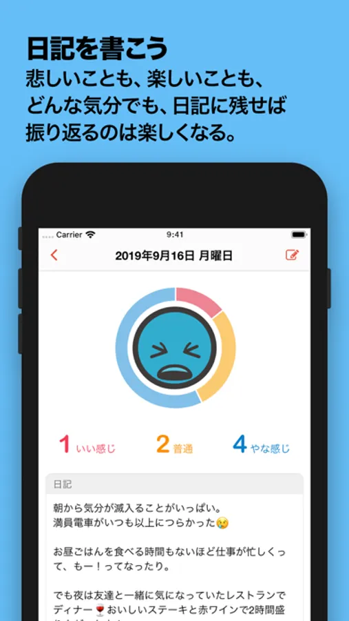今の気分を素早く記録しましょう。『いい感じ』、『普通』、『やな感じ』の3つのどれかを選ぶだけで記録完了。大事な言葉や写真を一緒に記録したり、気分をコメントでも残しておけます。