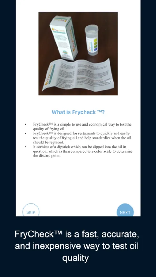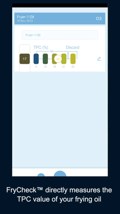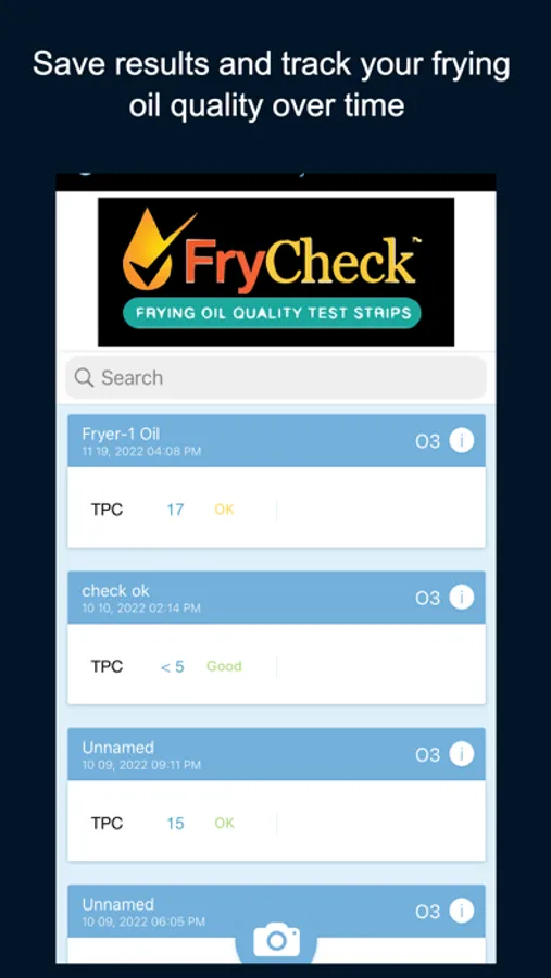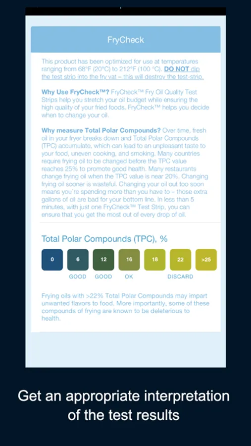 This companion app aids in the interpretation of the FryCheck™ test strips to gain an objective result for the quality and TPC value of the oil. Utilizing color calibration, this app accounts for ambient conditions to provide an accurate and fast result that removes the biases and variability of reading by eye. The results can be annotated and stored in the app for later reference or tracking over time. To use the app, simply follow in the FryCheck™ instructions for use provided with the test strips, select the camera icon in the app and snap a picture of the test strip when the timer runs out. The app will show the results as a numerical TPC value and a quality designation.