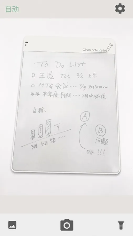 摄像头对准普乐士环保书写魔(Clean note kaite)板将书写魔板完全进入摄像画面,软件自动读取书写面后自动拍摄(自动模式时)。软件会自动对拍摄时倾斜的画面进行校正,转化成清晰的数据图片。