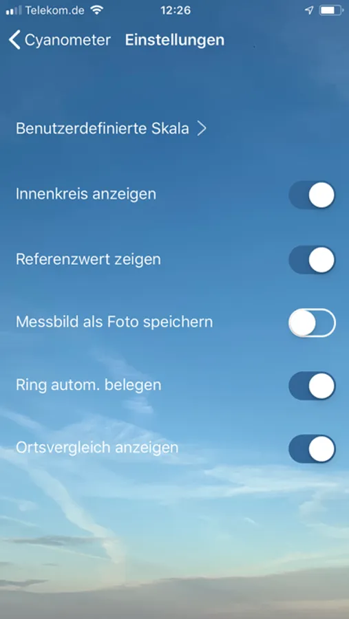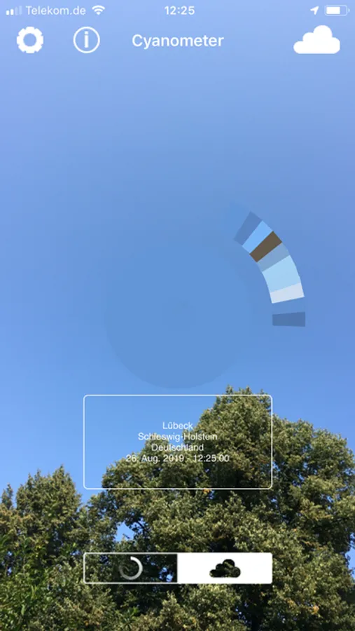 You can use our Cyanometer in three modes: The modern scale uses distinct grades of blue starting with clear white up to black. The Saussure scale shall give an idea about the colors from Saussures original cyanometer. With the user defined scale own scans of blue skies can be added to an own colored circular ring - an own cyanometer.