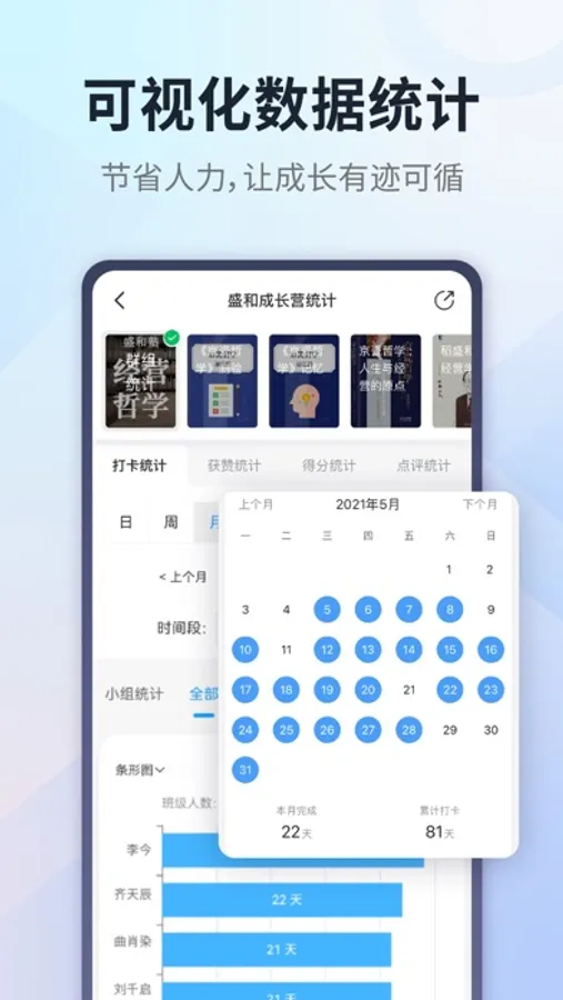 - 学习数据跟踪:完善的学习打卡数据统计,有效节省人力的统计成本,量化评估;