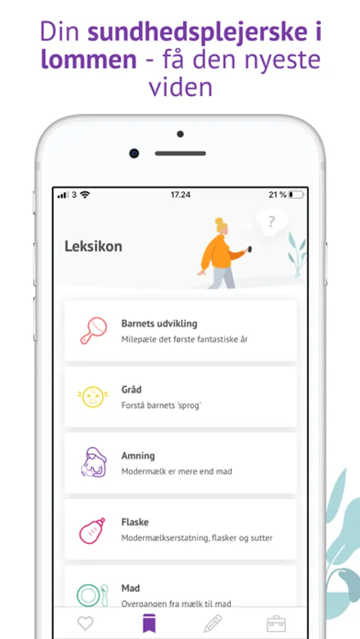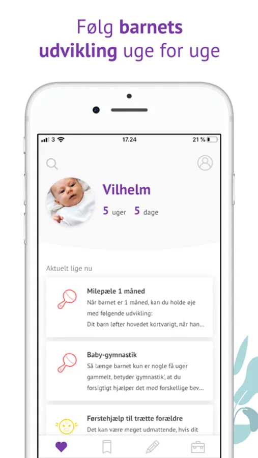 Appen guider dig igennem dit barns udvikling og minder dig om vaccinationer, børneundersøgelser, D-vitamindråber og meget mere. Derudover indeholder appen en række nyttige redskaber, som den magiske sove-lyd, tjeklister til sikkert børneudstyr og Barnets bog, som er din personlige scrapbog med fotos og sjove oplevelser.