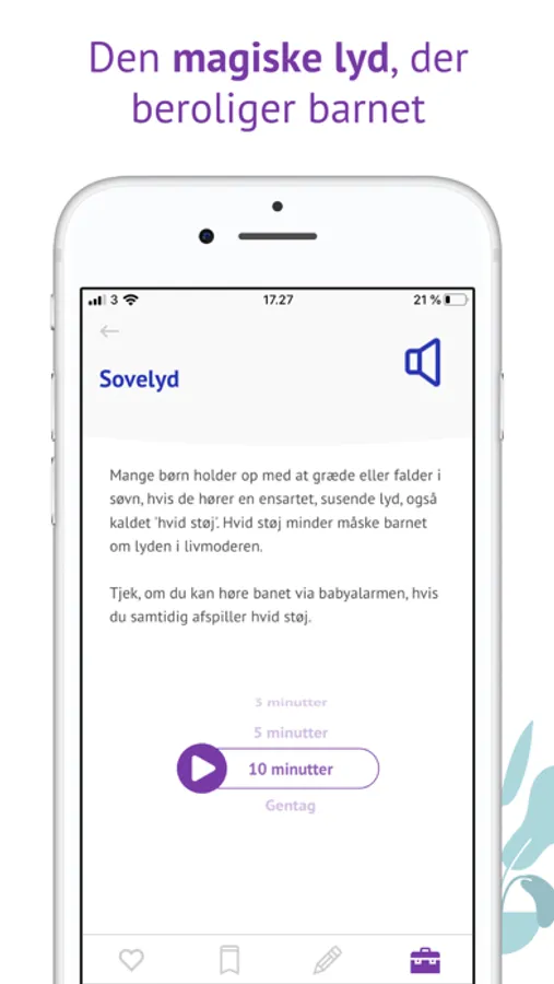 Søvn: Støt barnets søvn og få hjælp til søvnproblemer. Nyttigt redskab: Søvndyssende lyd, som du kan afspille for barnet, når det er uroligt.