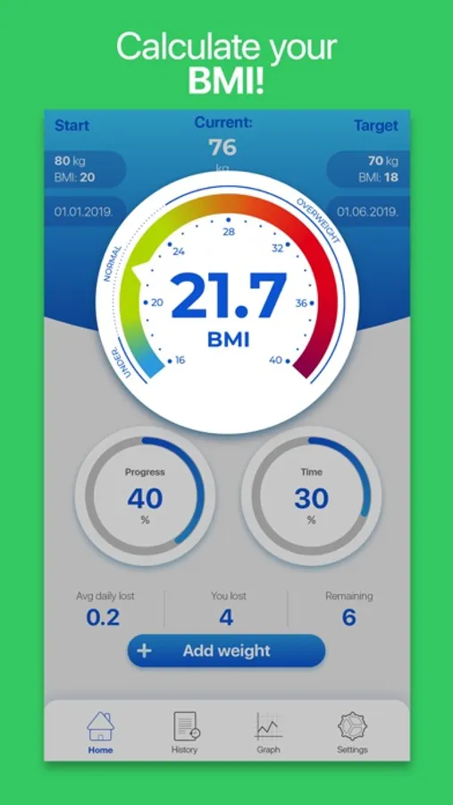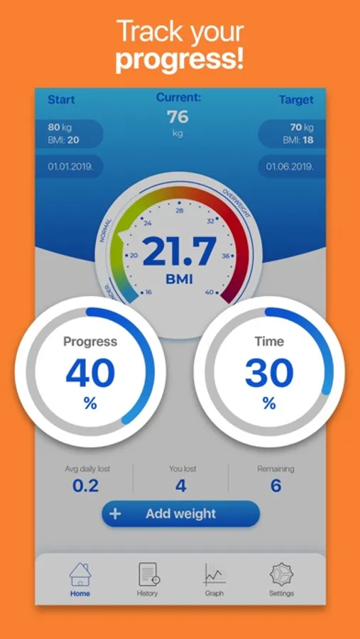 Monitor your weight and get precise reports about your daily weight changes to reach predefined goals! Weight Tracker: BMI Calculator will inform you about your goal progress and you will know what to do in order to reach your ideal weight. Calculate your BMI, learn about your daily calorie requirements and write a diet diary that will help you keep track of weight modifications.