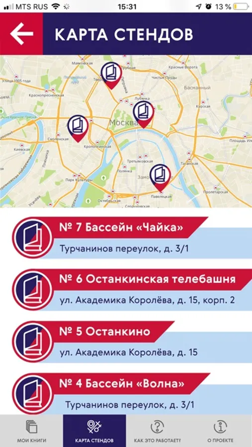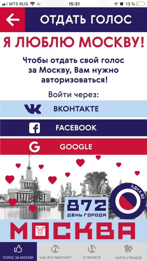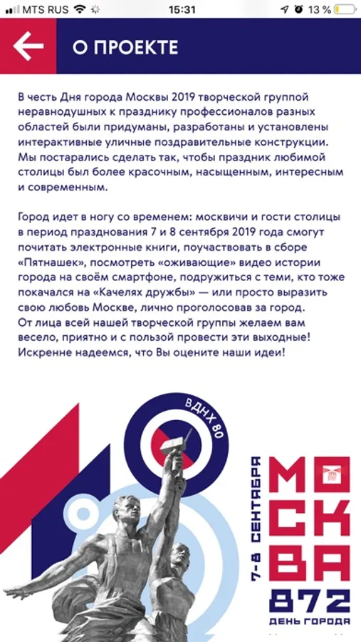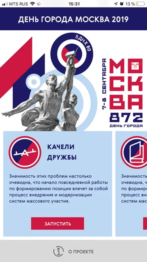 В честь Дня Города Москвы 2019 разработаны и установлены интерактивные уличные познавательно-развлекательные конструкции. С их помощью в период празднования 7 и 8 сентября 2019 года вы можете почитать электронные книги, поучаствовать в сборе "фото-пятнашек", подружиться с теми, кто покачался на "Качелях дружбы" - или просто выразить свою любовь Москве, лично проголосовав за город. Найдите уличную конструкцию, выберите ее в этом приложении - и примите участие в городском интерактиве! Список и адреса уличных конструкций можно найти в этом приложении после его установки.