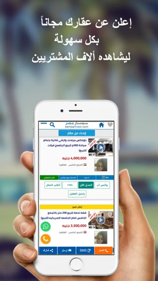 يمكنك من خلال تطبيق سمسار مصر Semsar Masr إضافة عقارك مجانا وبدون عمولة من خلال موبايلك بكل سرعة وسهولة.