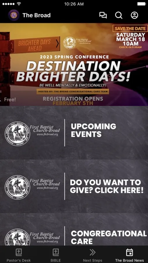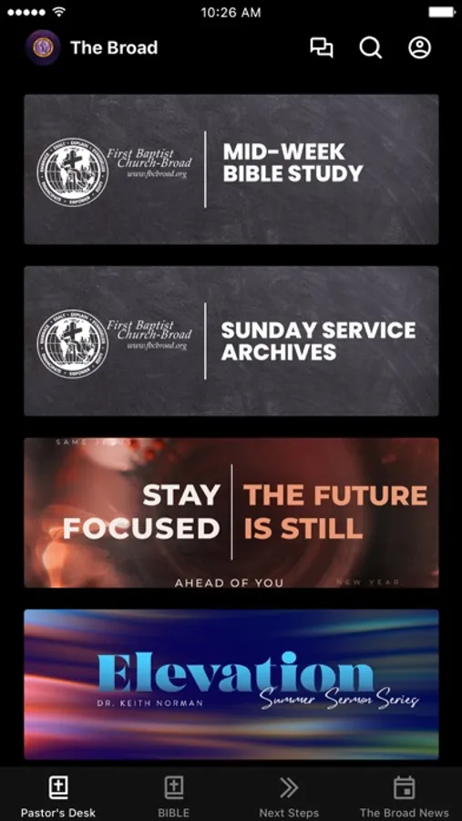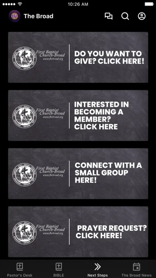 This app will help you stay connected with the day-to-day life of First Baptist Church Broad. With this app you can: watch or listen to past messages; stay up to date with push notifications; share your favorite messages via Twitter, Facebook, or email; and download messages for offline listening.