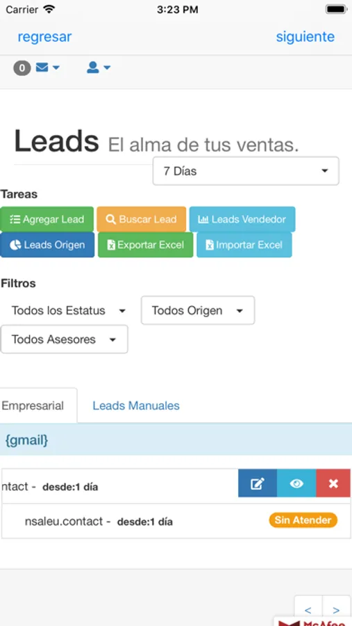 Gestiona y asegúrate que todos los leads/correos de venta sean atendidos rápidamente por tus vendedores, con la plataforma web revisa estadísticas, tiempos de respuesta, entre otros datos que te permitirán saber como va la gestión y el manejo de los leads por parte de tus vendedores.