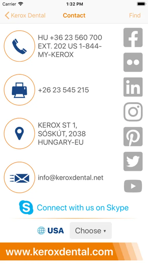 Contact us through the app: call us on phone or on Skype, send an e-mail, find us on the map or check out our social media profiles.