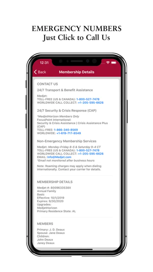 Download the App. Log in with your Medjet Membership Number and the Primary Member’s Date of Birth. With a tap of your screen, you will have quick access to:
