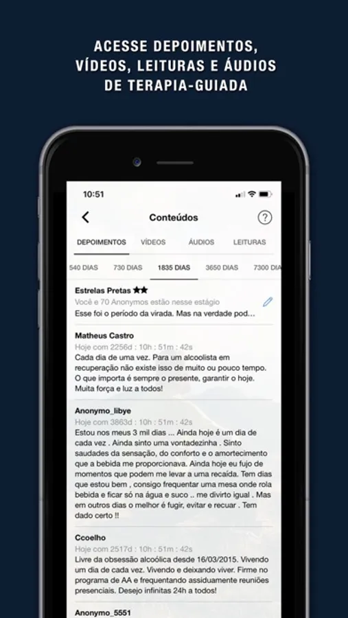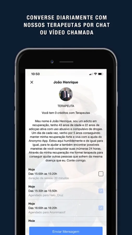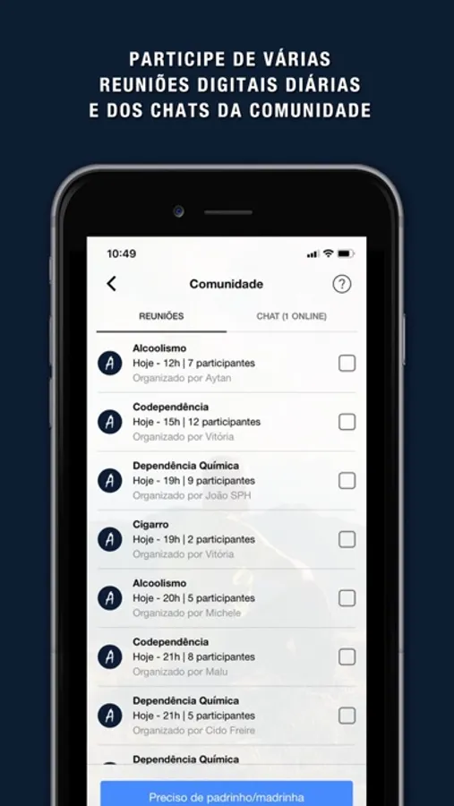 Nossos terapeutas credenciados vão te apadrinhar e te acolher diariamente, via chat individual ou vídeo-chamadas, para te ajudar a enfrentar dificuldades do dia-dia e te direcionar rumo a uma melhor qualidade de vida. Você também terá acesso ilimitado a reuniões diárias em grupo, chats e ferramentas de autoconhecimento, além de leituras, depoimentos, vídeos, áudios e terapias guiadas.