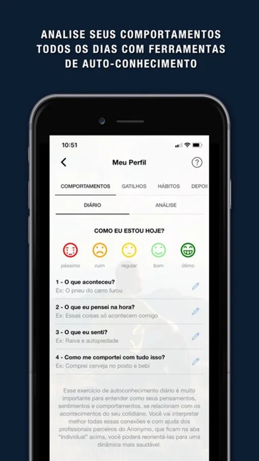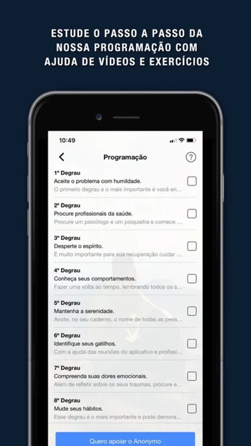 Quase 13 milhões de brasileiros sofrem com problemas relacionados ao uso excessivo de álcool ou drogas e somente 1 em cada 7 busca ajuda antes que algo de pior aconteça. E mais de 28 milhões de familiares (codependentes), lutam diariamente para tentar manter um relacionamento saudável com os dependentes. Nós já ajudamos mais de 50 mil pessoas a conviverem melhor com esses problemas e vamos ajudar você também. Vamos te ajudar a se perdoar, a se estabilizar e a se sentir você mesmo novamente. Tudo isso de forma totalmente anônima, 100% virtual e sem você precisar sair de casa ou abandonar sua rotina diária.