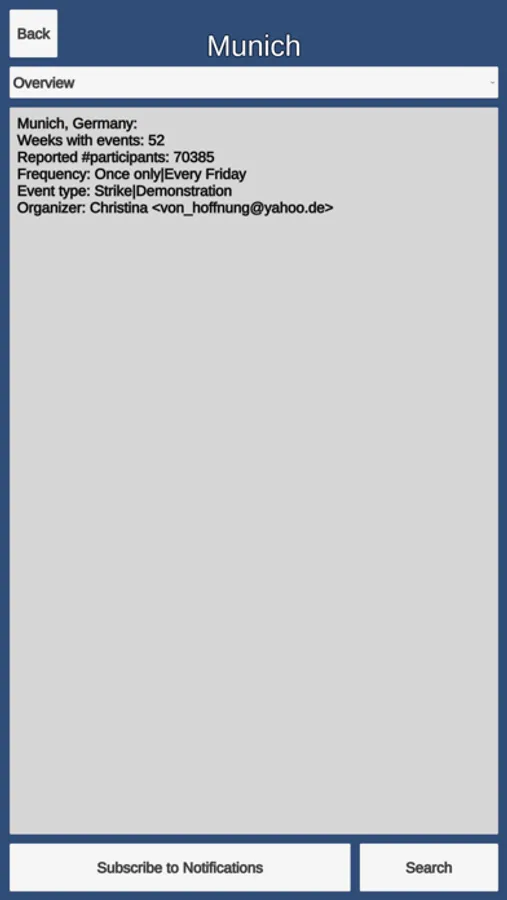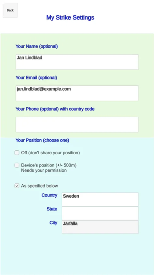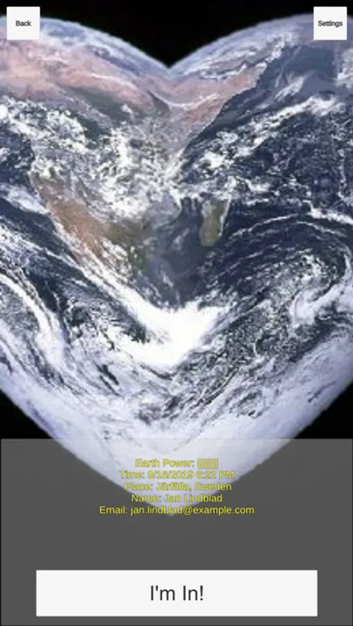 The other thing you can do in this app is to report your own participation in FFF events. Whenever you are on a strike or other event which makes the same demands as Greta did, you can press the My Action button, then the Settings button. In there, fill in as much contact details as you would like to share, then press the back button. Once you see the earth-heart, pump up the heartbeat by pushing it repeatedly.