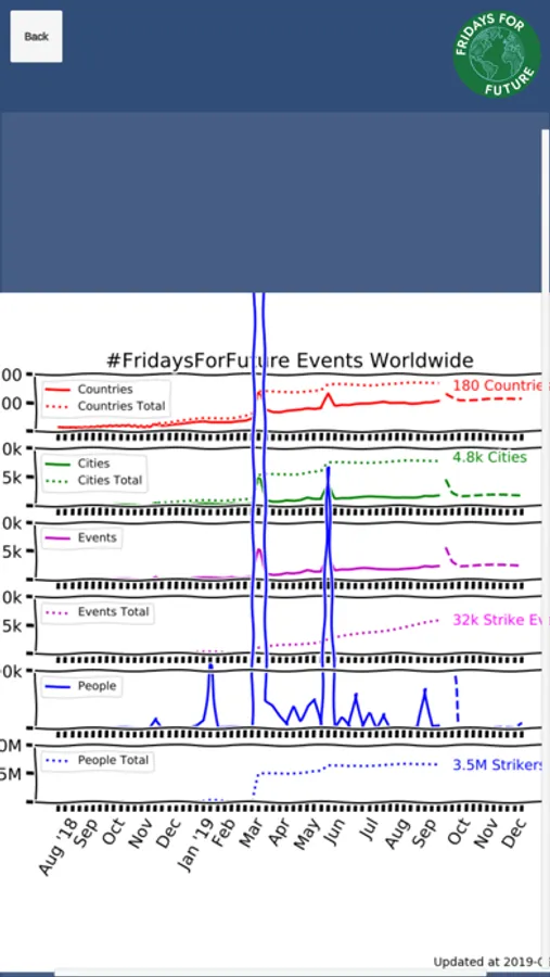 Fridays For Future (FFF) is the movement started by Greta Thunberg when she sat down in a school strike front of the Swedish parliament building on August 20, 2018. Since then, strikes supporting the cause have been happening in nearly 200 countries, several thousand cities, in tens of thousands individual events with millions of strikers. You can follow the daily updates to these stats in this app.
