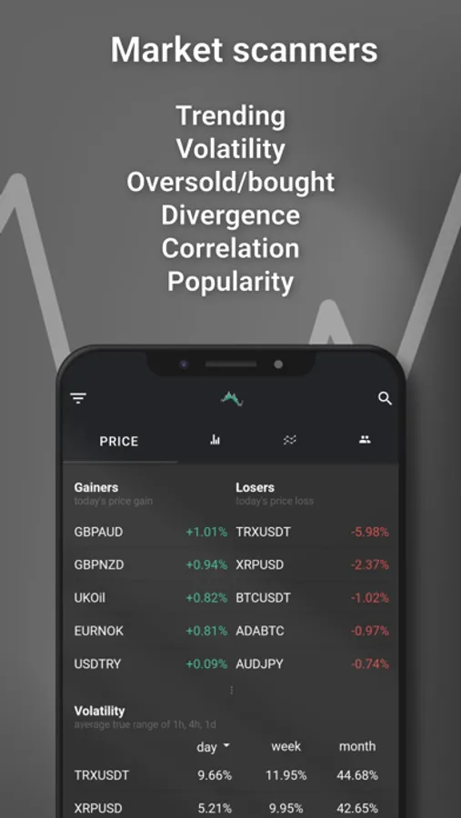 Browse assets by price and volume changes, long-term and intra-day trending (EMA, MVWAP), volatility (ATR), oversold and overbought (RSI), divergence, correlation, and popularity (Google Trends). Conveniently, filters can be applied to the list of assets.