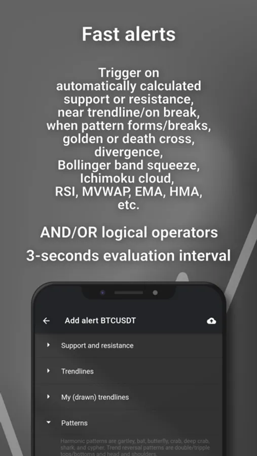 An alert is possible to trigger near automatically-calculated support or resistance, trigger on trend line breaks (drawn or automatically detected trend lines), triangle breakouts, trend reversals, harmonics, and more.