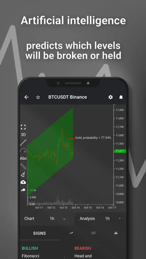 Artificial intelligence predicts which levels will be broken or held based on raw market movement, EMA, HMA, MACD, Bollinger Bands, Keltner Bands, ATR, RSI, and Ichimoku cloud.