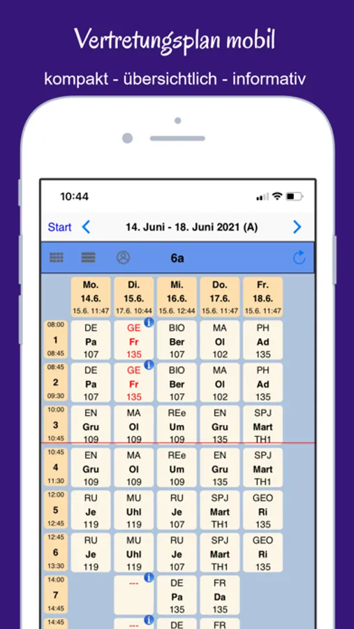 Mit der App VpMobil24 kann der aktuelle Stundenplan einer Klasse, eines Lehrers bzw. eines Raumes - einschließlich aller Vertretungen - abgerufen werden. Änderungen werden dabei rot hervorgehoben. Die Kurse eines Schülers sind individuell einstellbar, sodass die Anzeige auf den eigenen Unterricht eingeschränkt werden kann. Es können 3 verschiedene Schulen verwaltet werden. Zum schnellen Wechsel zwischen verschiedenen Klassen-, Lehrer- bzw. Raumplänen können je Schule bis zu 5 Favoriten ausgewählt werden.