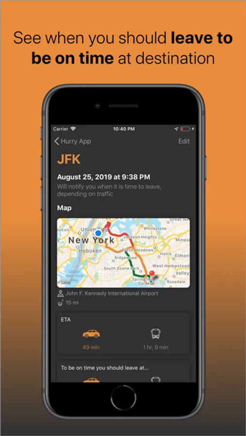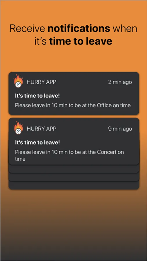 Hurry App will notify you, what time you need to leave in order to be on time.
