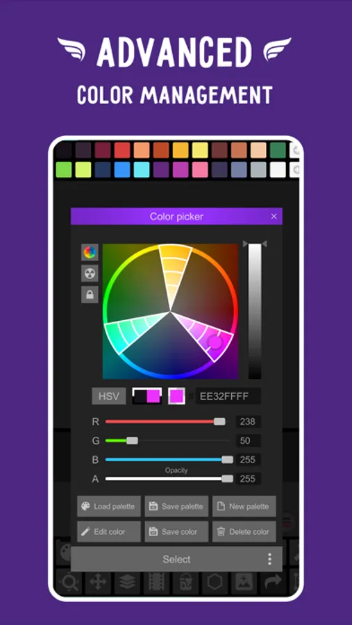 • We support all popular formats: PNG, JPG, GIF, BMP, PSP (Pixel Studio Project), ASE (Aseprite)
