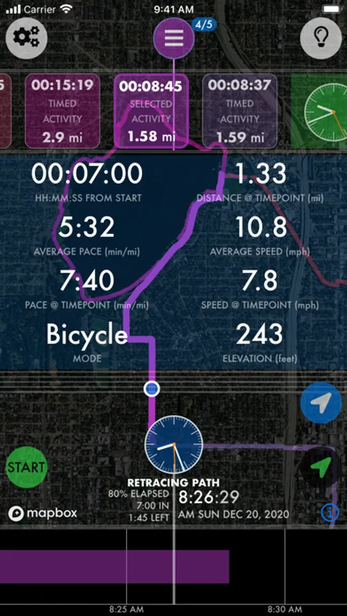 The magic is the way Pathify lets you navigate through the domains of time, space, and data all at once. Visualize your activities as a chronological sequence on a continuously scrollable, zoomable timeline. Spin an analog clock back and forth, like an old-fashioned time machine, to review your location history on the map. Watch the numbers spin as a marker follows your former track.
