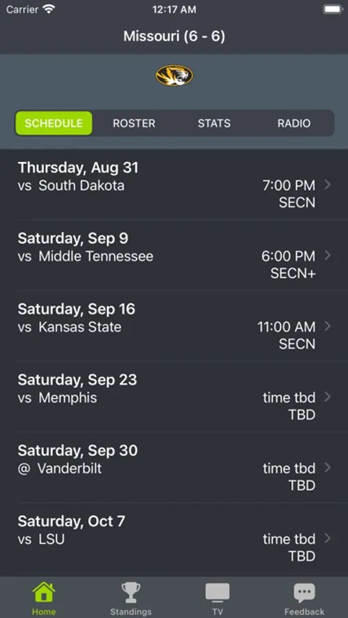 Missouri Football Schedules provides scores, links to live radio, schedules, tv channels, player profiles, and game matchups in one location.