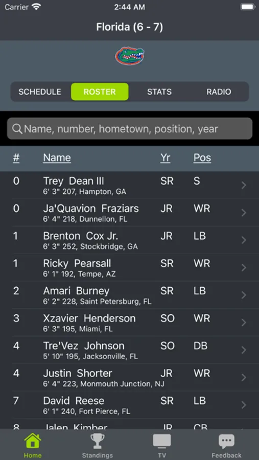 Head-to-head matchups for all of the Florida football games. Link to live radio, get scores, schedules, rosters, tv channels, and stats.