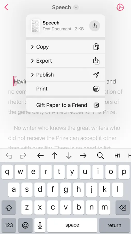 · On the main screen with documents: Tap and hold the document. Select "Share" from the menu.