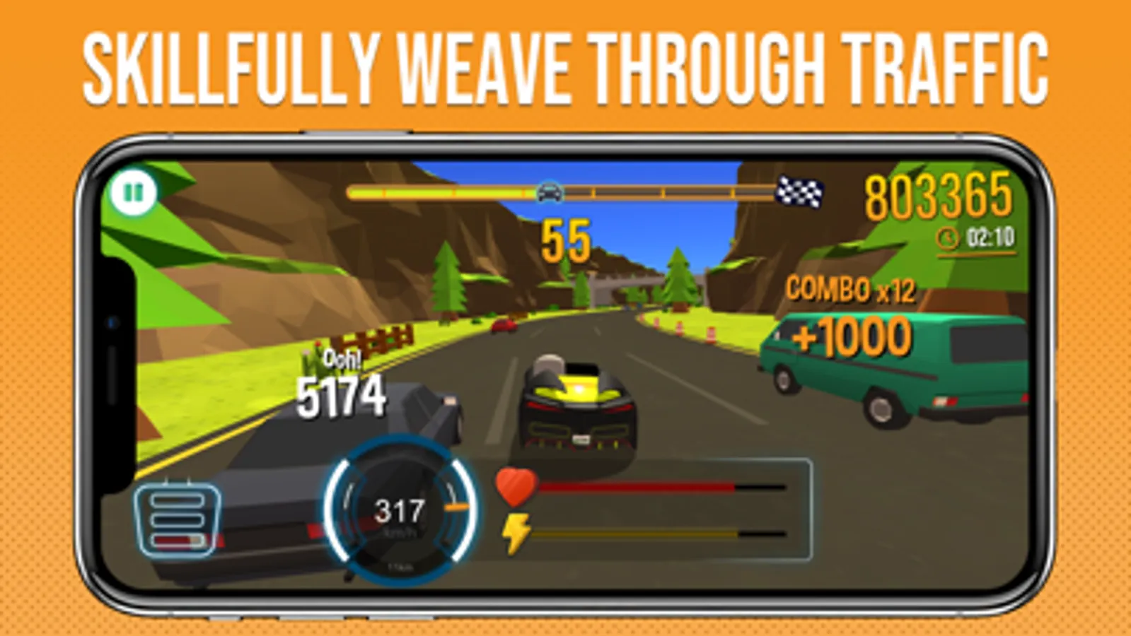 Challenging and electrifying. The more skillfully you weave through traffic the more you earn!