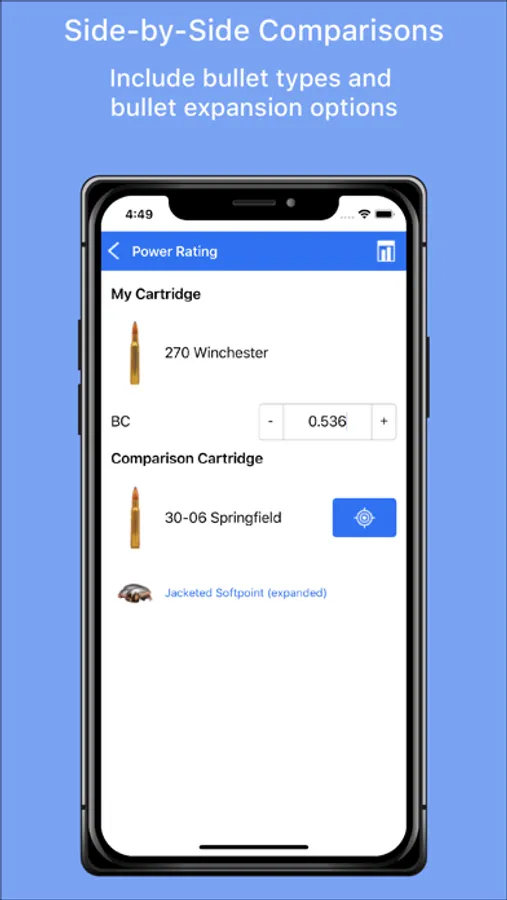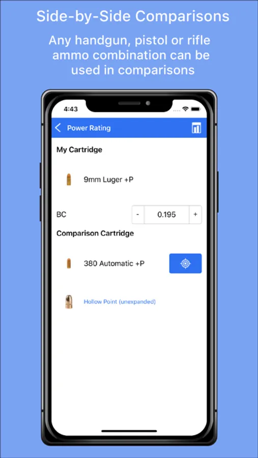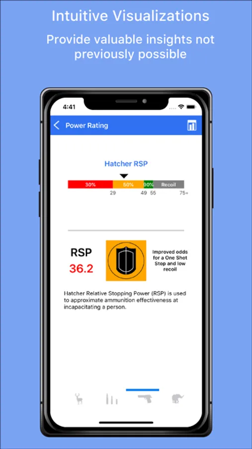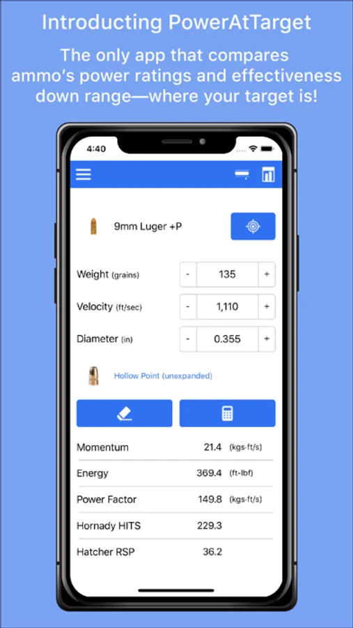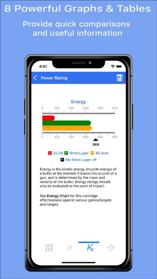 Power At Target is the only comprehensive application providing hunters, shooting enthusiasts, and self-defense users all pistol and rifle cartridge Power Rating benchmarks allowing for quick identification of the ideal cartridge that is both powerful and manageable.