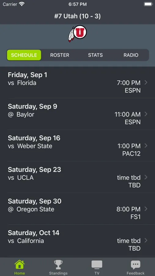 Utah Football Schedules provides scores, links to live radio, schedules, tv channels, player profiles, and game matchups in one location.
