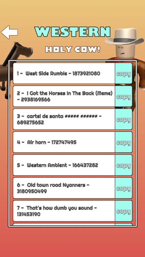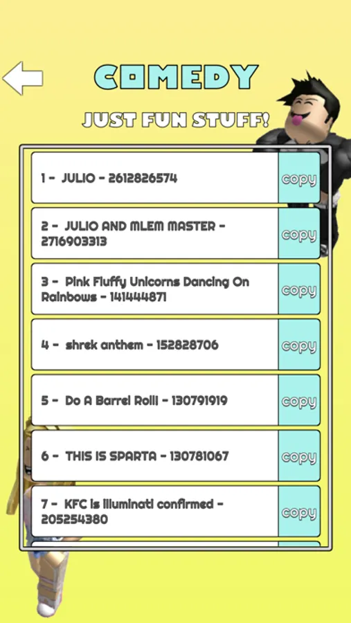 This app let's you get the most popular music codes to play in Roblox. Just find the song you would like to play and copy the code into your game! it is THAT simple!
