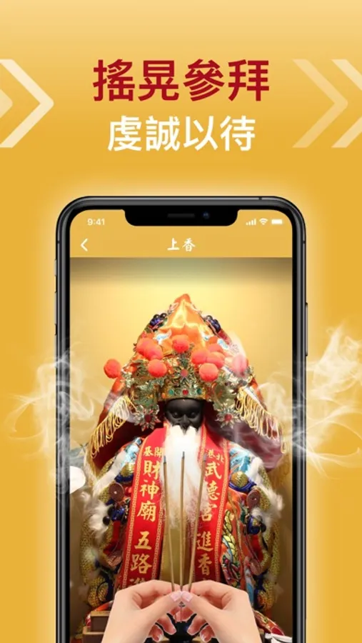 求好運的方式非常簡單!只要免費下載武財神應用程式,進入上香頁面後,上下晃動手機,接著就能完成上香的儀式!無論你在家裡、在公司、在旅遊中,都能天天向武財神參拜。