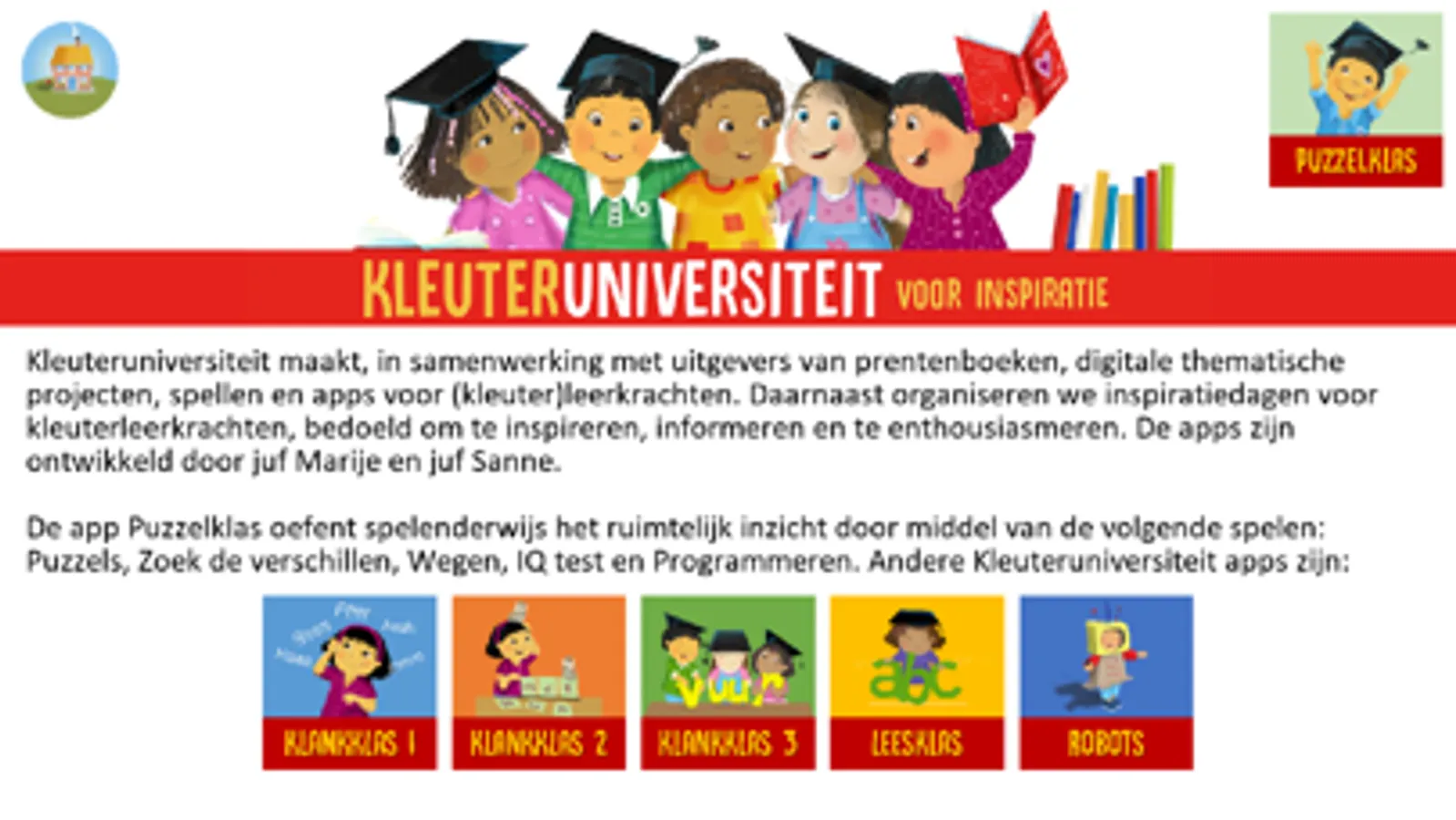 Na de apps klankklas en leesklas brengt Kleuteruniversiteit nu de app puzzelklas, een leerzame app met verschillende puzzels en hersenkrakers die de kinderen moeten oplossen. De app biedt vijf verschillende spellen: Puzzels, Zoek de verschillen, Wegen, IQ test en Programmeren. Wanneer een spel wordt voltooid, spelen de kinderen een minigame als beloning. Een leuke app die zich richt op doelen als: logisch redeneren, ruimtelijk inzicht en probleemoplossend vermogen.