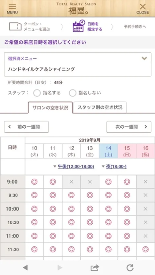 ご希望のメニュー・日時を指定して予約できます。安心してご予約ください。