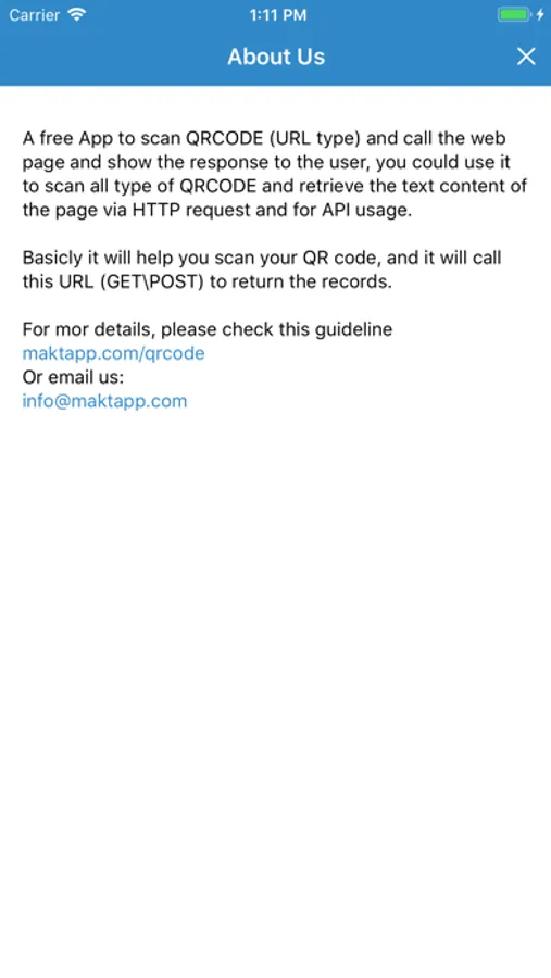 A free App to scan QRCODE (URL type) and call the web page and show the response to the user, you could use it to scan all type of QRCODE and retrieve the text content of the page via HTTP request and for API usage.