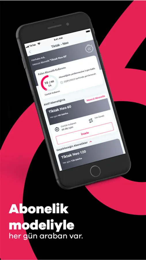 Her gün arabaya ihtiyacın varsa, yeni nesil araba sahipliği TikTak Neo ile, 30 gün boyunca dilediğin arabayı tıpkı kendi araban gibi her gün kullanmaya başla. Günlük 1 saat, 2 saat ya da 3 saat paketlerinden ihtiyacına uygun olanı satın al, sana en yakın arabayı kendi araban gibi kullan.